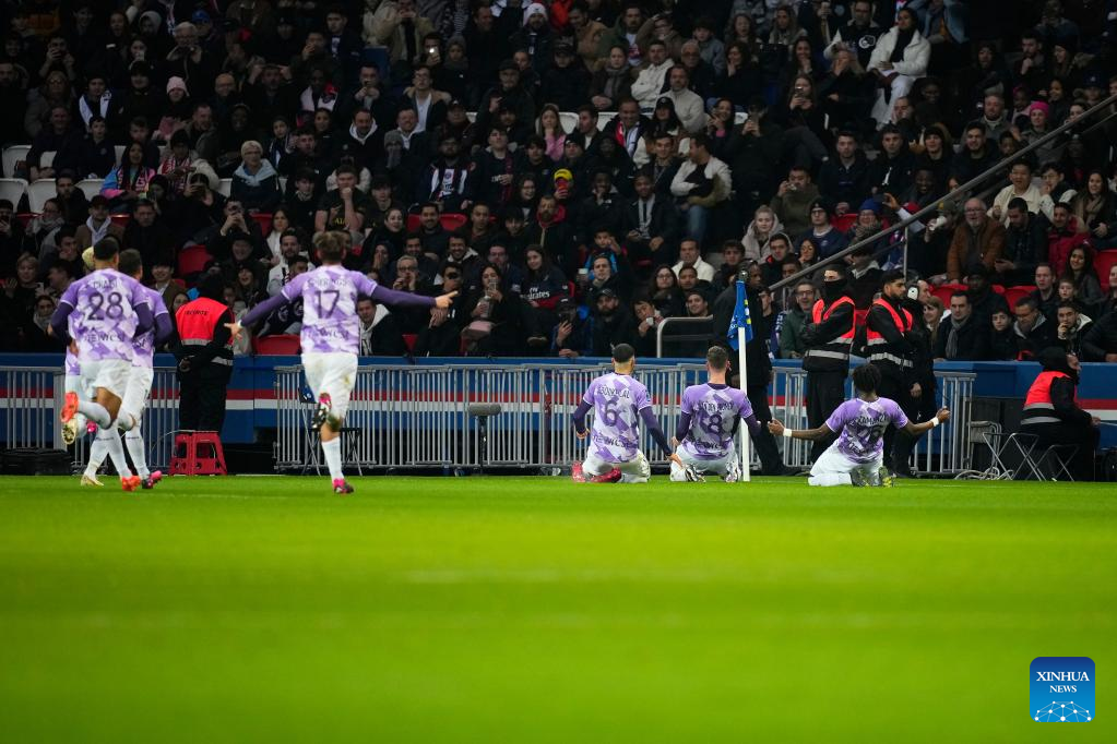 Players of Toulouse FC celebrate their first goal of the game during a French Ligue 1 football match between Paris Saint-Germain (PSG) and Toulouse FC in Paris, France, Feb. 4, 2023. (Photo by Glenn Gervot/Xinhua)