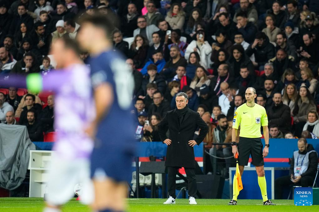 Paris Saint-Germain's head coach Christophe Galtier (2nd R) looks at his players during a French Ligue 1 football match between Paris Saint-Germain (PSG) and Toulouse FC in Paris, France, Feb. 4, 2023. (Photo by Glenn Gervot/Xinhua)