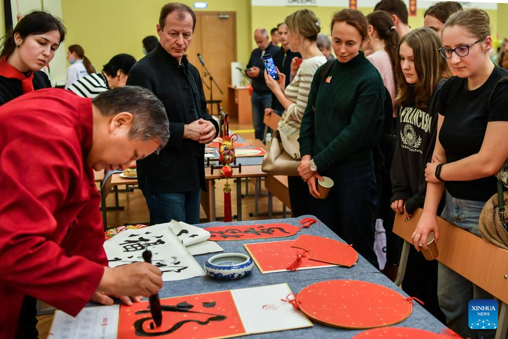 Students watch an artist writing Chinese calligraphy in celebration of the Chinese Lunar New Year at the Confucius Institute of the Russian State University for the Humanities in Moscow, capital of Russia, Feb 3, 2023. (Xinhua/Cao Yang)