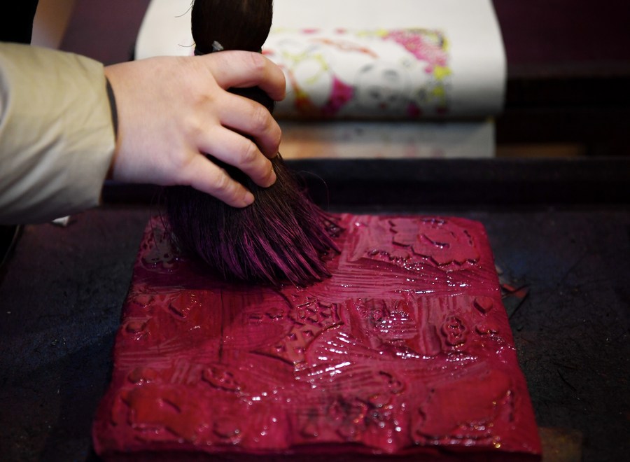 An artist makes woodblock New Year paintings at the Wuqiang woodblock New Year painting museum in Wuqiang County, north China's Hebei Province, Feb. 3, 2023. (Xinhua/Mu Yu)