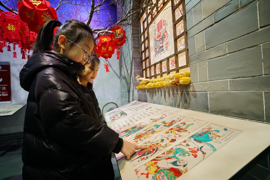A tourist visits the Wuqiang woodblock New Year painting museum in Wuqiang County, north China's Hebei Province, Feb. 3, 2023. (Xinhua/Mu Yu)