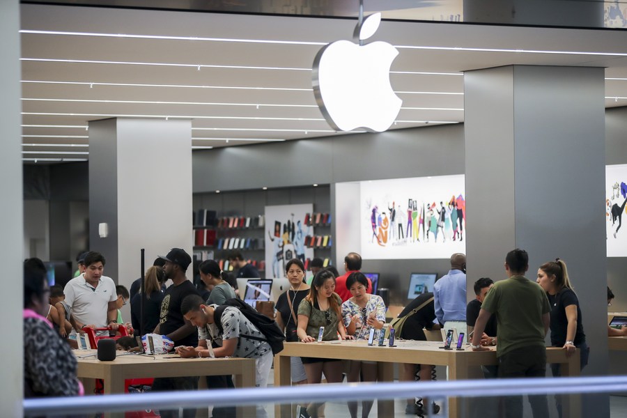 Customers select products at an Apple store in New York, the United States, Aug. 2, 2018. (Xinhua/Wang Ying)