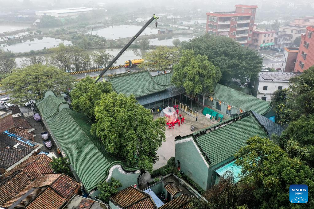 This aerial photo taken on Jan. 12, 2023 shows a giant costume of the "Lion King" lifted to be on display during a parade in Foshan, south China's Guangdong Province. (Xinhua/Liu Dawei)