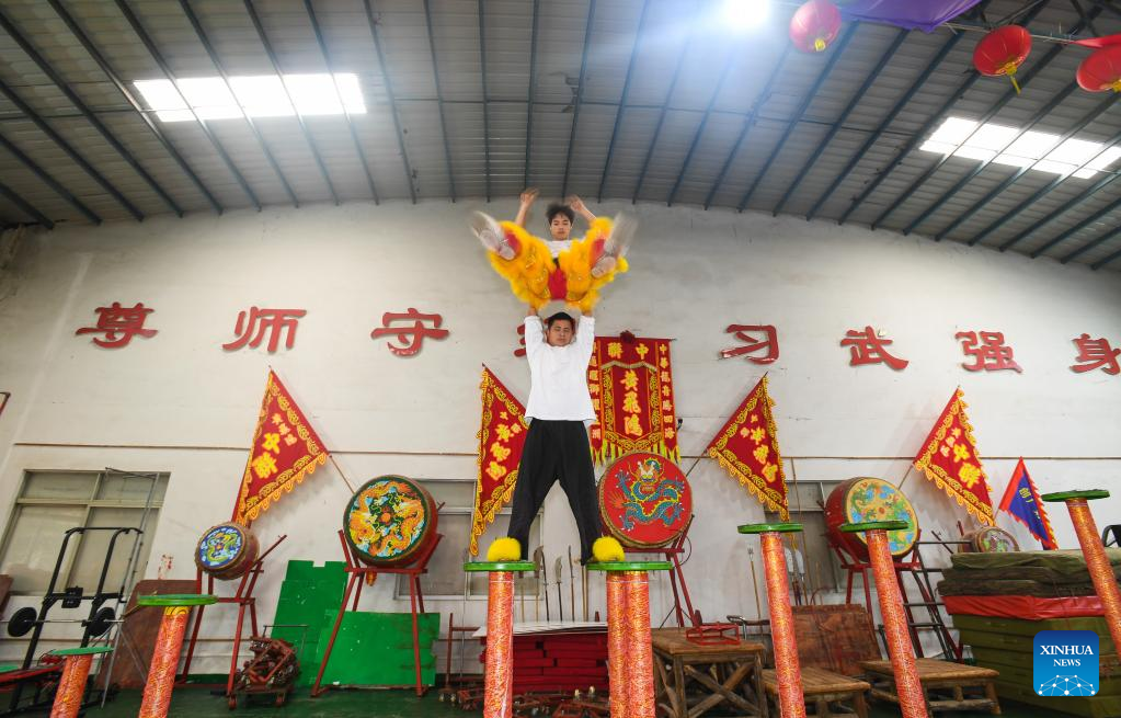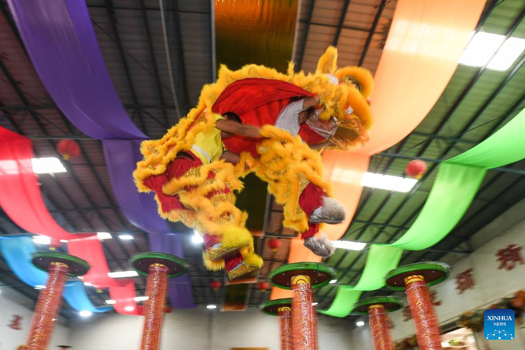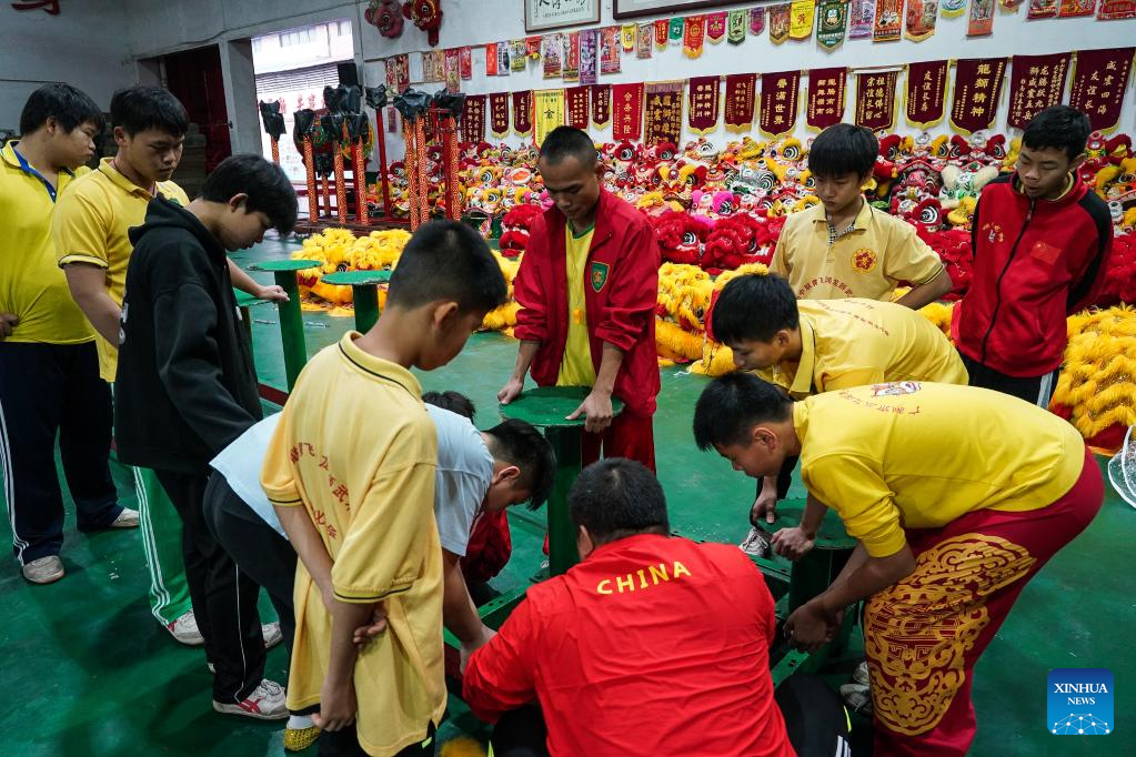 Guangdong Lion Dancers practice at a training base in Foshan, south China's Guangdong Province, Jan. 13, 2023. (Xinhua/Liu Dawei)