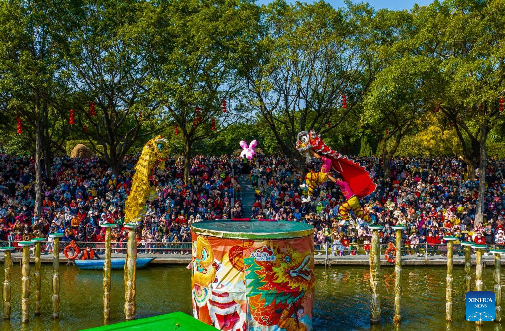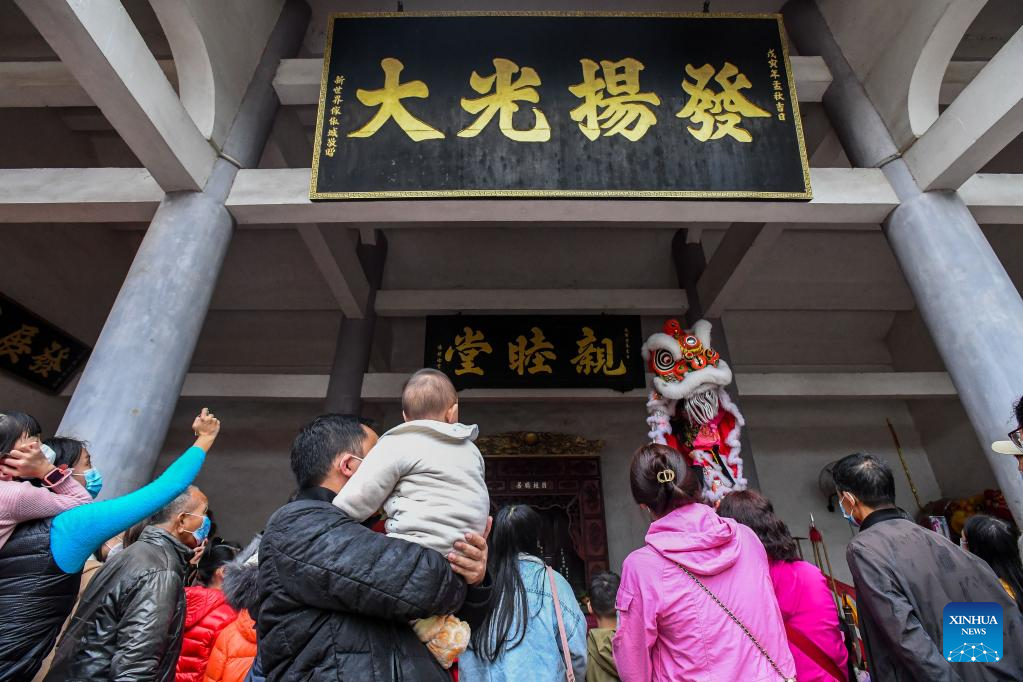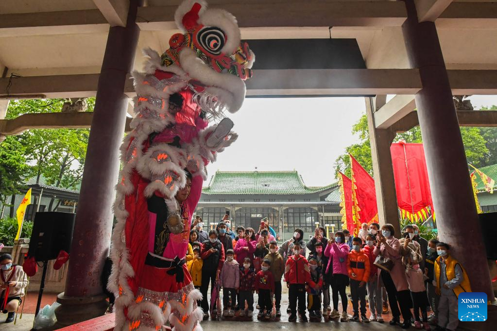 Tourists enjoy a Guangdong Lion Dance show in Foshan, south China's Guangdong Province, Jan. 12, 2023. (Xinhua/Liu Dawei)