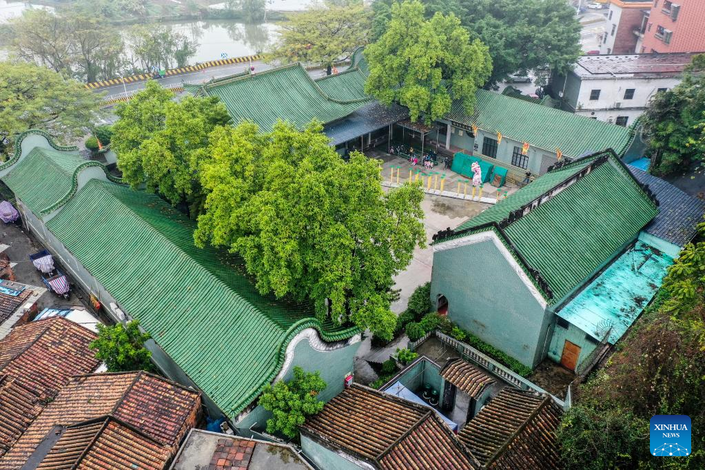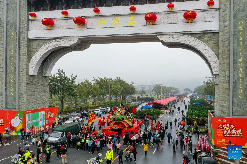 This aerial photo taken on Jan. 24, 2023 shows people enjoying a Guangdong Lion Dance show in Foshan, south China's Guangdong Province. (Xinhua/Liu Dawei)