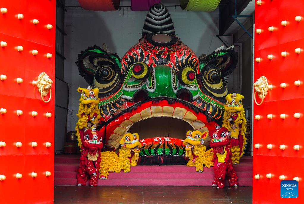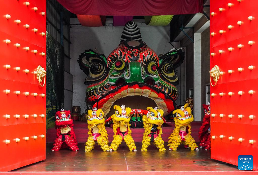 Guangdong Lion Dancers are seen at a training base in Foshan, south China's Guangdong Province, Jan. 13, 2023. (Xinhua/Liu Dawei)