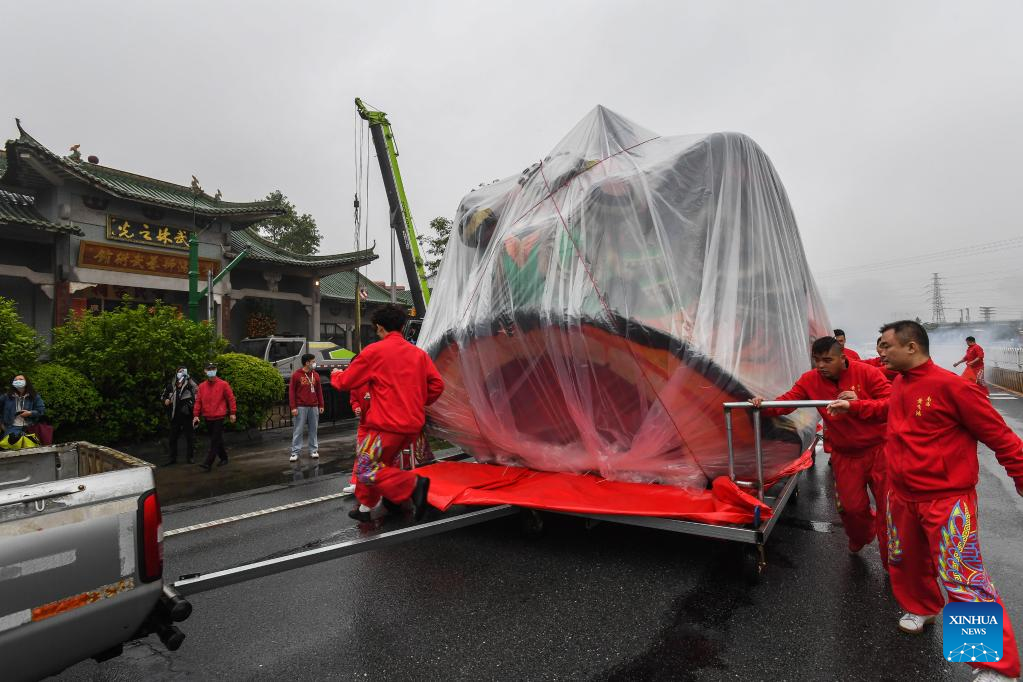 A giant costume of the "Lion King" is lifted to be on display during a parade in Foshan, south China's Guangdong Province, Jan. 12, 2023. (Xinhua/Liu Dawei)