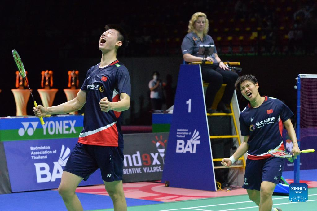 Feng Yanzhe/Huang Dongping (R) of China celebrate after the mixed doubles final match between Feng Yanzhe/Huang Dongping of China and Seo Seung Jae/Chae Yu Jung of South Korea at the Thailand Masters 2023 in Bangkok, Thailand, Feb. 5, 2023. (Xinhua/Rachen Sageamsak)