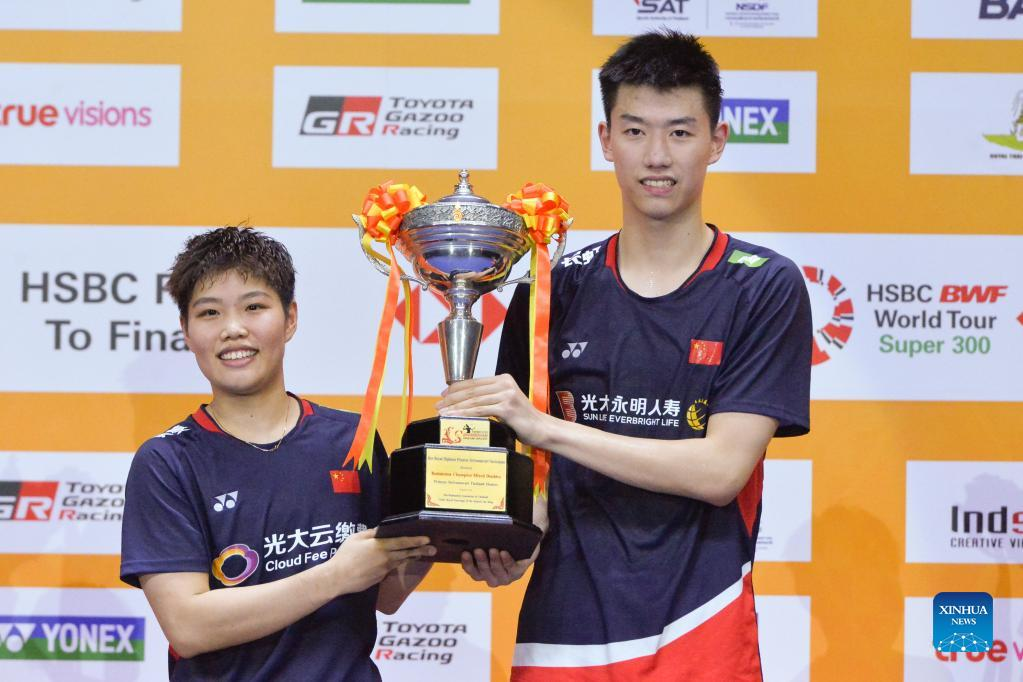 Feng Yanzhe/Huang Dongping (L) of China pose with their trophy after the awarding ceremony of the mixed doubles final match between Feng Yanzhe/Huang Dongping of China and Seo Seung Jae/Chae Yu Jung of South Korea at the Thailand Masters 2023 in Bangkok, Thailand, Feb. 5, 2023. (Xinhua/Rachen Sageamsak)
