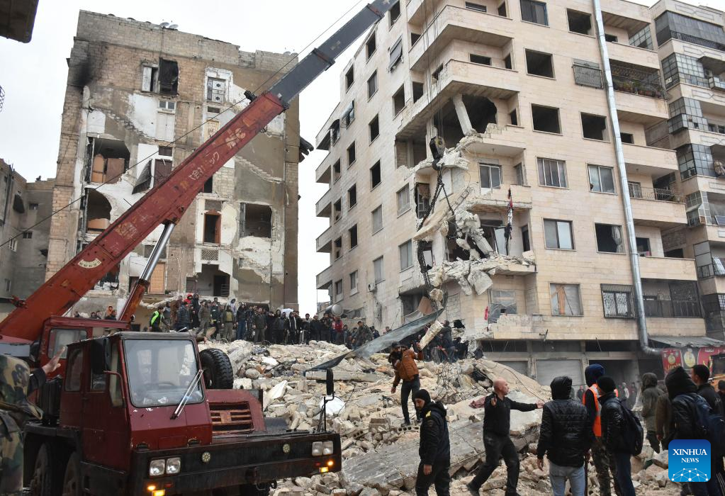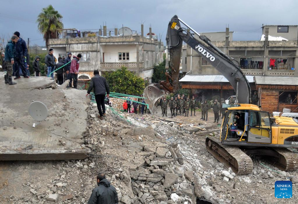 Rescuers work near the rubble of a building destroyed in a powerful earthquake in the city of Jableh, Latakia province, Syria, on Feb. 6, 2023. According to the Syrian health ministry and the Britain-based pro-rebel Syrian Observatory for Human Rights, a 7.7-magnitude earthquake jolted the northern Syrian provinces of Latakia, Tartous, Hama, Aleppo and Idlib on Monday, killing at least 870 and injuring 1,326. (Str/Xinhua)