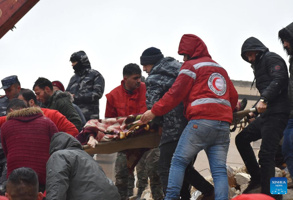 People transfer a victim of a powerful earthquake in the al-Arbaeen neighborhood in Hama province, Syria, on Feb. 6, 2023. According to the Syrian health ministry and the Britain-based pro-rebel Syrian Observatory for Human Rights, a 7.7-magnitude earthquake jolted the northern Syrian provinces of Latakia, Tartous, Hama, Aleppo, and Idlib on Monday, killing at least 870 and injuring 1,326. (Str/Xinhua)