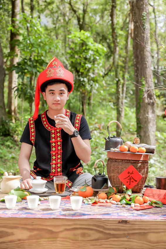 A man in traditional ethnic costume sips tea in Shuiman township, Wuzhishan city, south China’s Hainan Province. (Photo courtesy of the publicity department of the CPC Wuzhishan Municipal Committee)