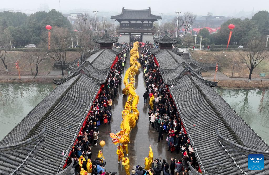 This aerial photo taken on Feb. 6, 2023 shows dragon dancers parading through the Taiping Bridge in Quanjiao County, east China's Anhui Province. (Photo by Shen Guo/Xinhua)