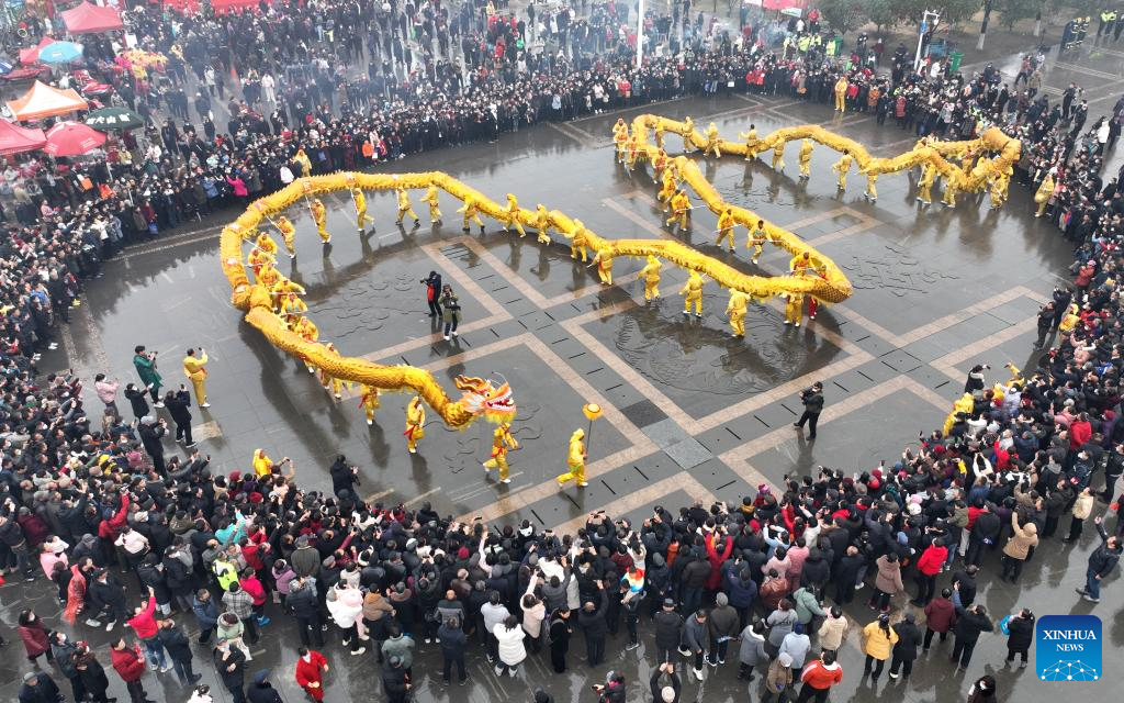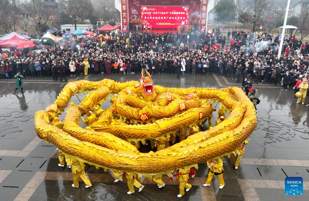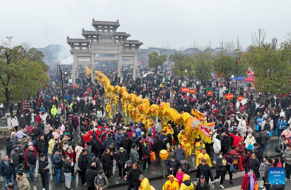 This aerial photo taken on Feb. 6, 2023 shows people watching dragon dance in Quanjiao County, east China's Anhui Province. (Photo by Shen Guo/Xinhua)