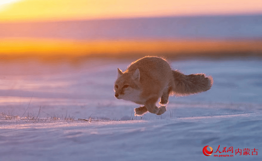 A corsac fox jumps in a snowfield, in north China’s Inner Mongolia Autonomous Region. (People’s Daily Online/Xiao Gang)