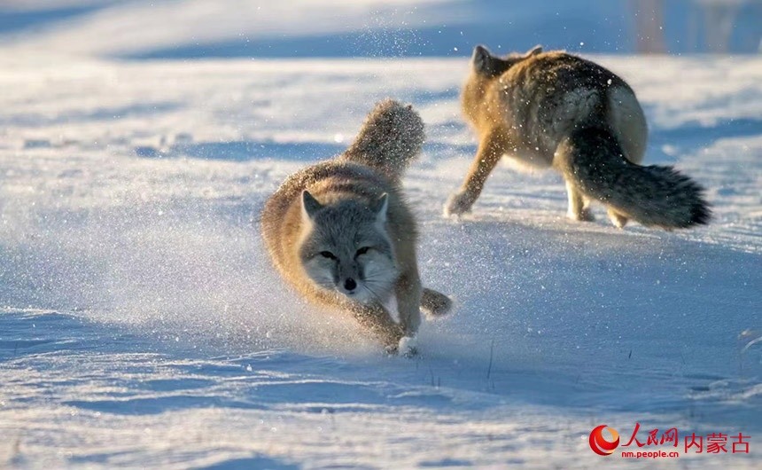Corsac foxes play in a snowfield, in north China’s Inner Mongolia Autonomous Region. (People’s Daily Online/Xiao Gang)