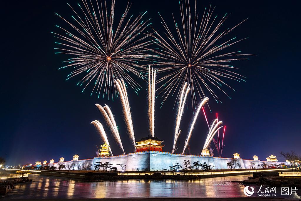Fireworks light up the sky during a fireworks show in Taiyuan, north China’s Shanxi Province, on Feb. 4, 2023. (People’s Daily Online/Lu Pengyu)