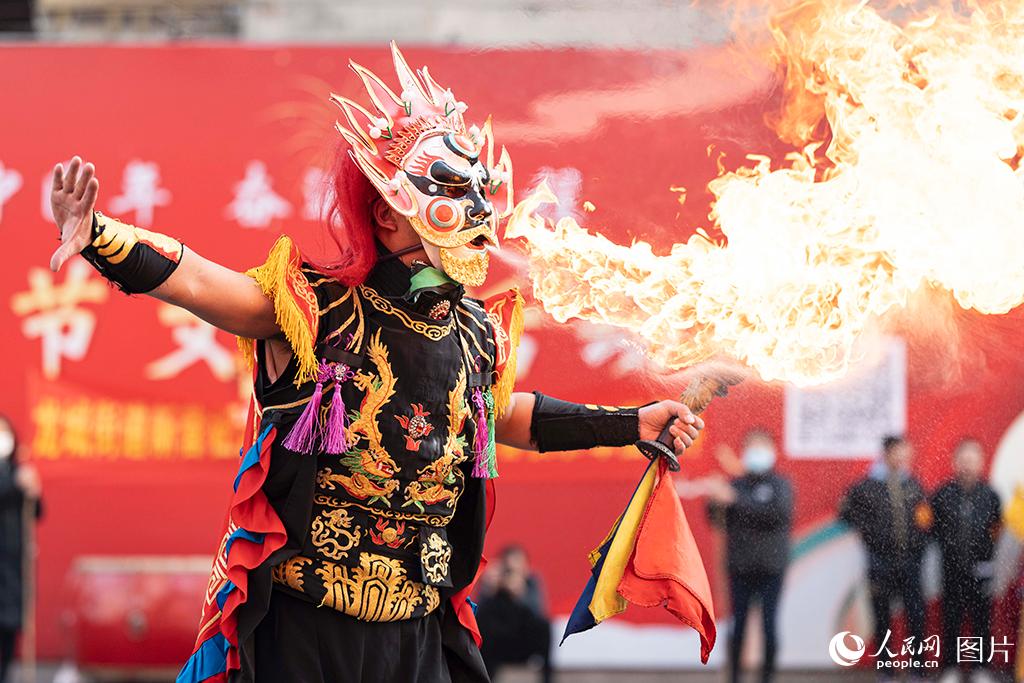 A performer demonstrates the art of fire-blowing, an essential part of Sichuan Opera, in Taiyuan, north China’s Shanxi Province. (People’s Daily Online/Lu Pengyu)