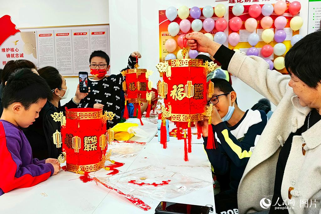 Residents make lanterns to celebrate the Lantern Festival in a community in north China’s Tianjin, on Feb. 5, 2023. (People’s Daily Online/Cui Xinyao)