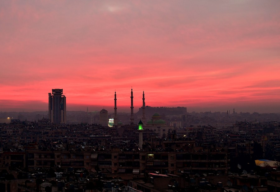 Sunrise scenery is pictured in Syria's northern city of Aleppo, March 6, 2022. (Photo by Ammar Safarjalani/Xinhua)