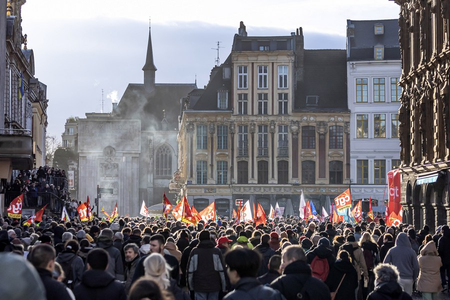 People participate in a demonstration against the government's controversial pension reform plan in Lille, northern France, on Jan. 31, 2023. (Photo by Sebastien Courdji/Xinhua)