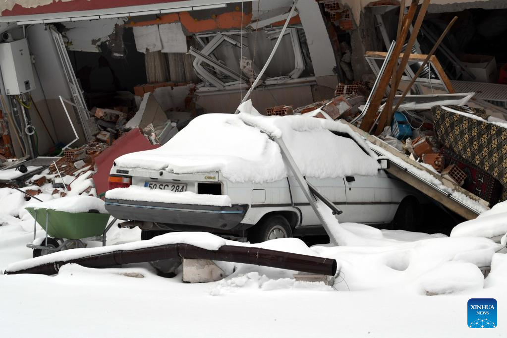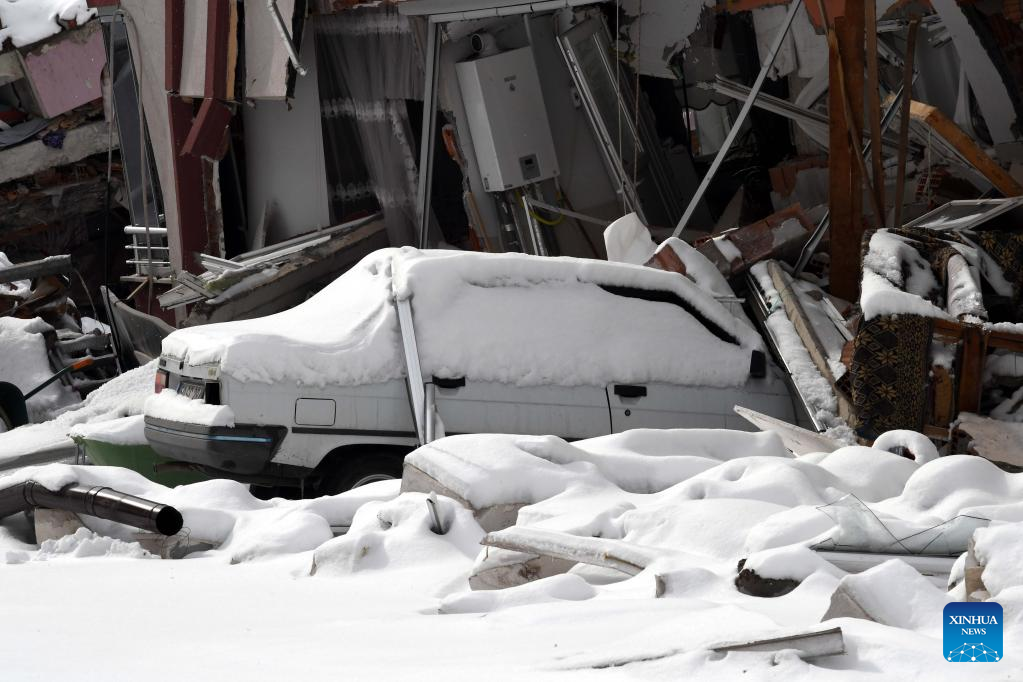 This photo taken on Feb. 7, 2023 shows damaged building and vehicle in Elbistan district of Kahramanmaras Province, Trkiye. (Xinhua/Shadati)