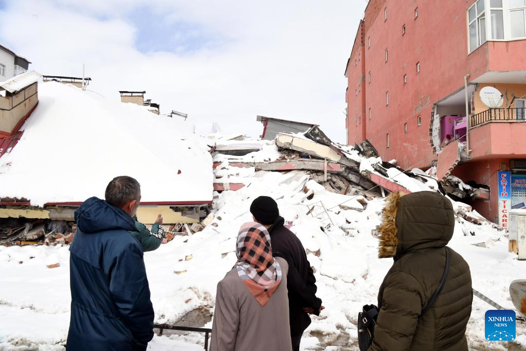 Residents check a damaged building in Elbistan district of Kahramanmaras Province, Trkiye, Feb. 7, 2023. (Xinhua/Shadati)