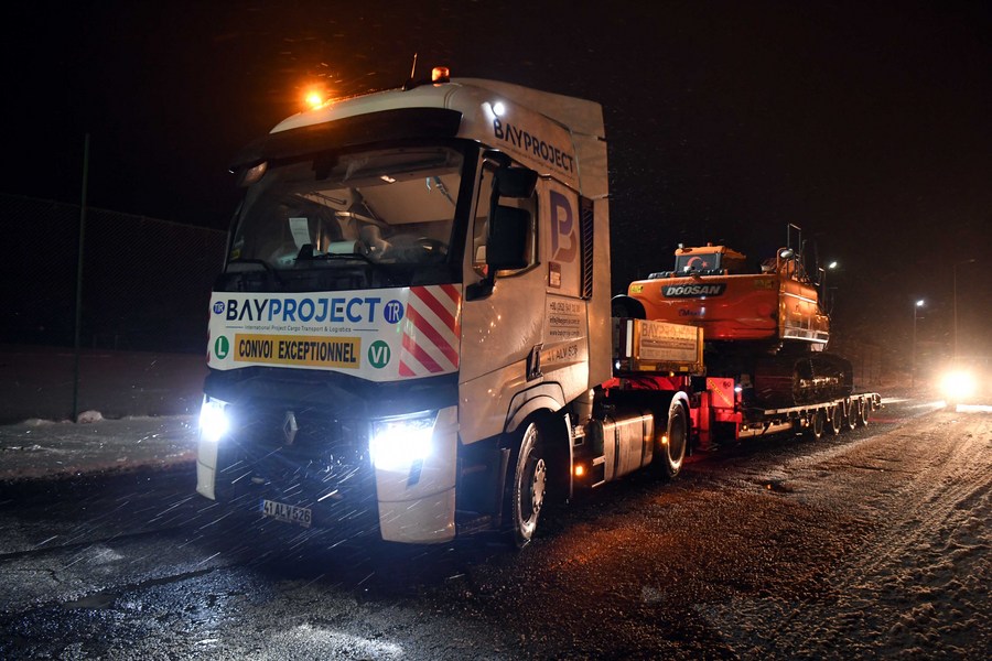 This photo taken on Feb. 6, 2023 show a vehicle transporting rescue machinery to the disaster area, on a road from Istanbul to Ankara in Türkiye. (Xinhua/Shadati)