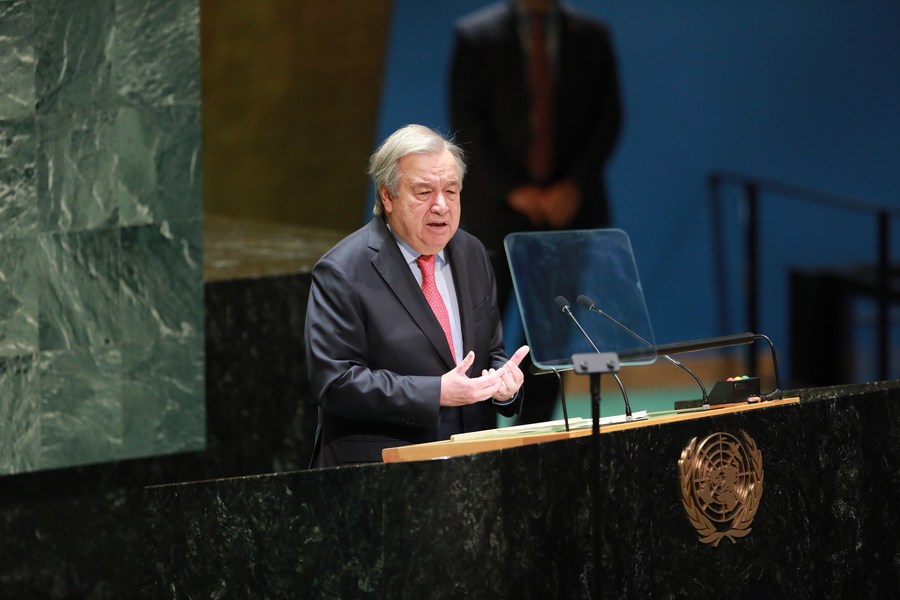 United Nations Secretary-General Antonio Guterres presents his priorities for the year to the UN General Assembly at the UN headquarters in New York, Feb. 6, 2023. (Xinhua/Xie E)