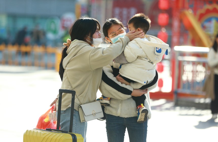 Photo shows a woman reluctant to part with her family before checking in at the Nanchang Railway Station in Nanchang, east China's Jiangxi Province. (Photo/Lu Yao)