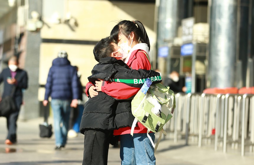 Two children hug each other before checking in at the Nanchang Railway Station in Nanchang, east China's Jiangxi Province. (Photo/Lu Yao)