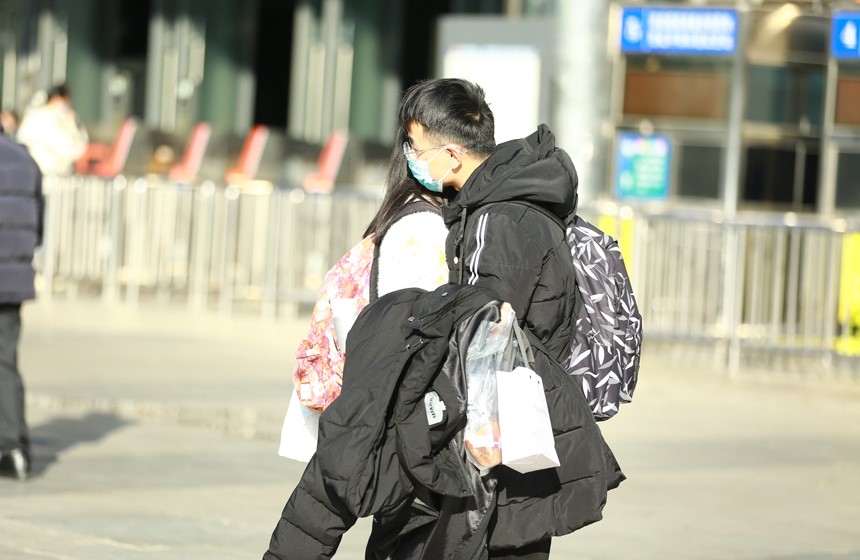 Lovers hug each other at a square in front of the Nanchang Railway Station in Nanchang, east China's Jiangxi Province. (Photo/Lu Yao)