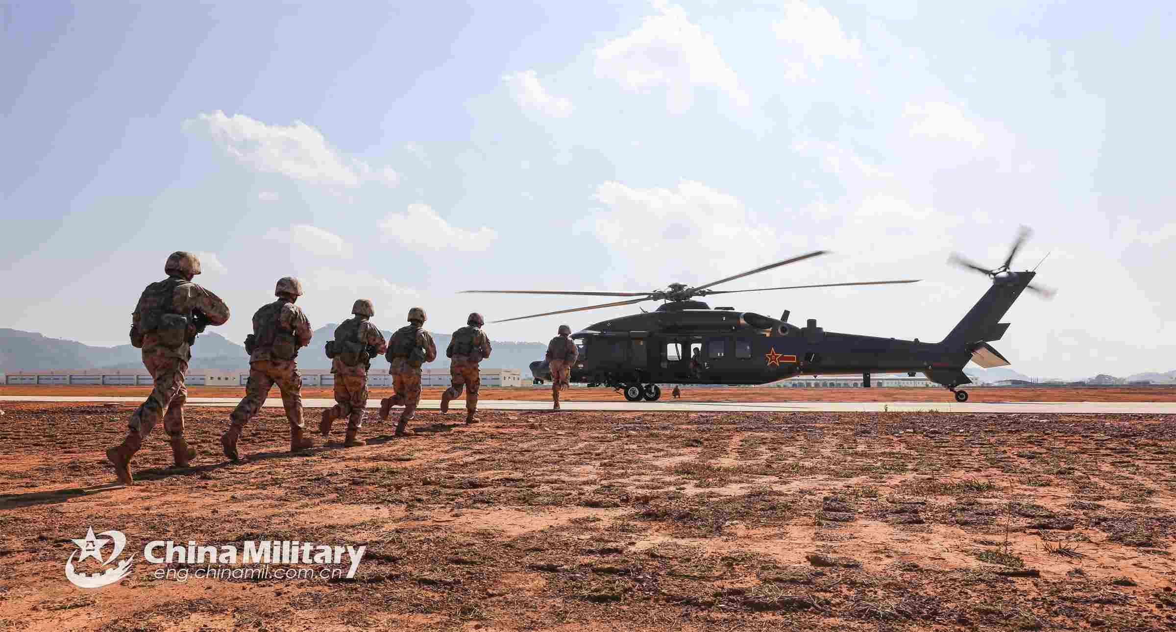 Soldiers assigned to an army brigade line up to board a helicopter during an air-ground training exercise recently. (eng.chinamil.com.cn/Photo by Sun Changyi)