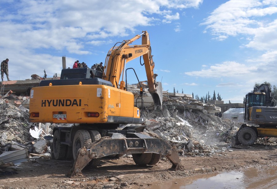 People search for survivors among the rubble of a building destroyed in a powerful earthquake in the town of Demsarkho of Latakia province, northwestern Syria, on Feb. 7, 2023. (Str/Xinhua)