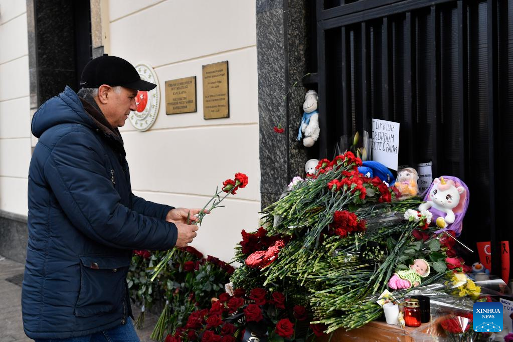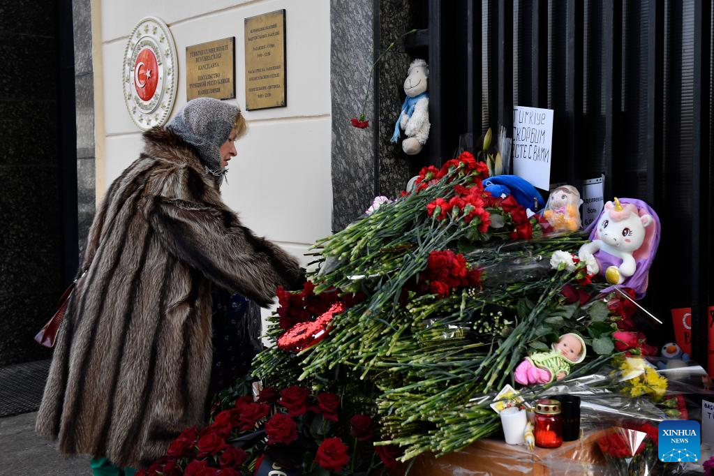 A man offers flowers in commemoration of victims of recent earthquakes in Trkiye at the Turkish Embassy in Moscow, Russia, on Feb. 8, 2023. (Photo by Alexander Zemlianichenko Jr/Xinhua)