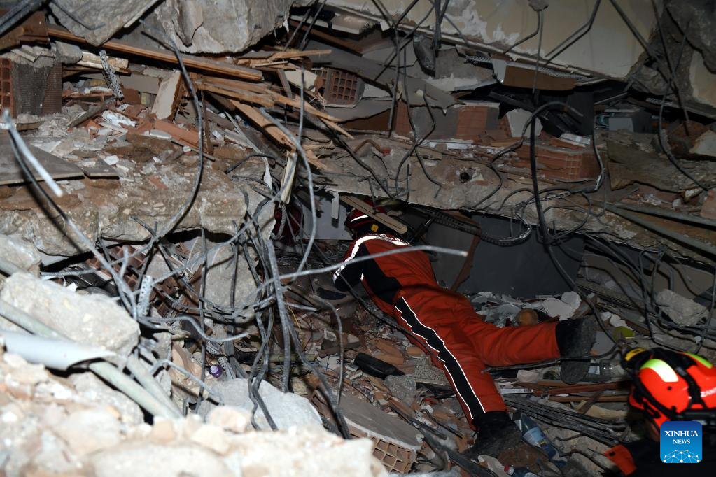 A members of the China Search and Rescue Team is in operation on earthquake debris in the southern province of Hatay, Trkiye, Feb. 8, 2023. (Xinhua/Shadati)