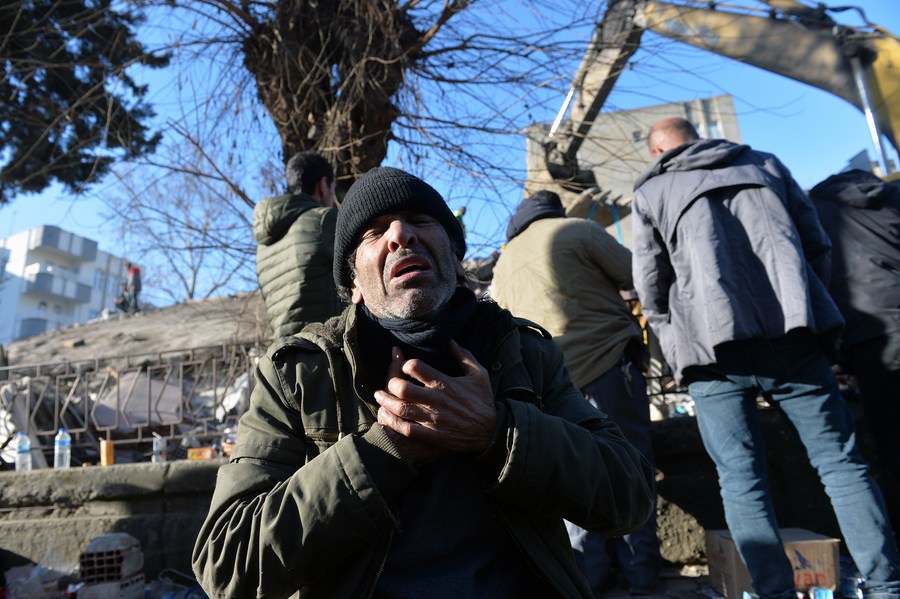 A man in grief while rescuers search for survivors among the debris of a building destroyed in the earthquake in Adiyaman Province, Türkiye, Feb. 9, 2023. (Photo by Mustafa Kaya/Xinhua)