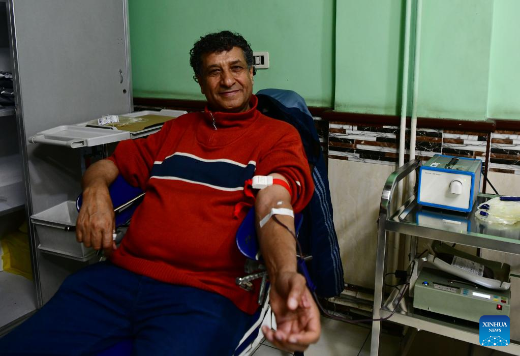 A man donates blood at a blood donation center in Damascus, capital of Syria, Feb. 8, 2023. The death toll from Monday's devastating earthquakes in Trkiye and Syria has surpassed 17,000, according to latest data. In Syria, at least 1,581 were killed in government-held areas, and the death toll in the opposition-held region is 1,975, according to media reports. (Photo by Ammar Safarjalani/Xinhua)