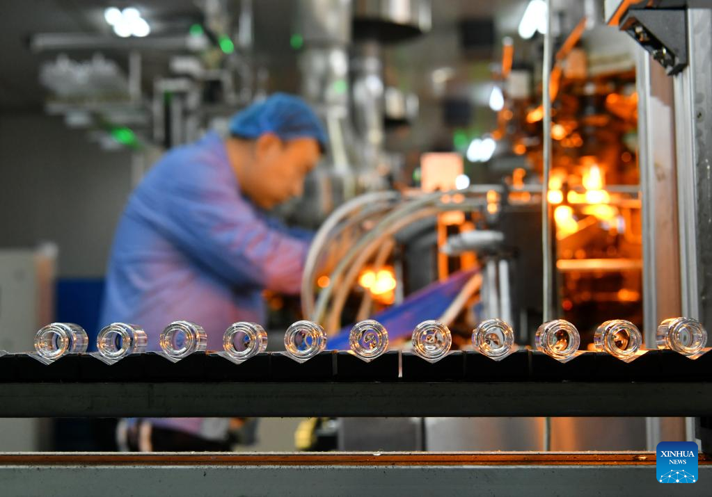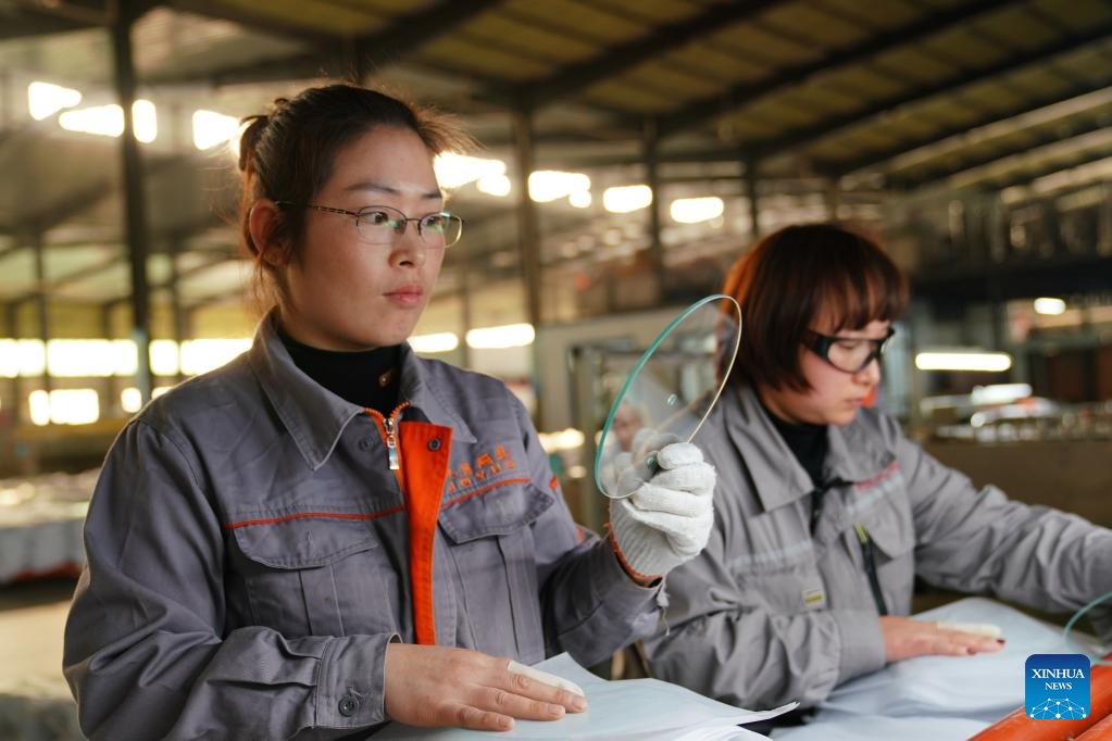 A worker checks glass products in the workshop of a glass company in Cangxian County, north China's Hebei Province, on Feb. 8, 2023. Hebei Province has focused on improving the innovation ability of small and medium enterprises and adopted a series of measures to support them. (Xinhua/Mu Yu)