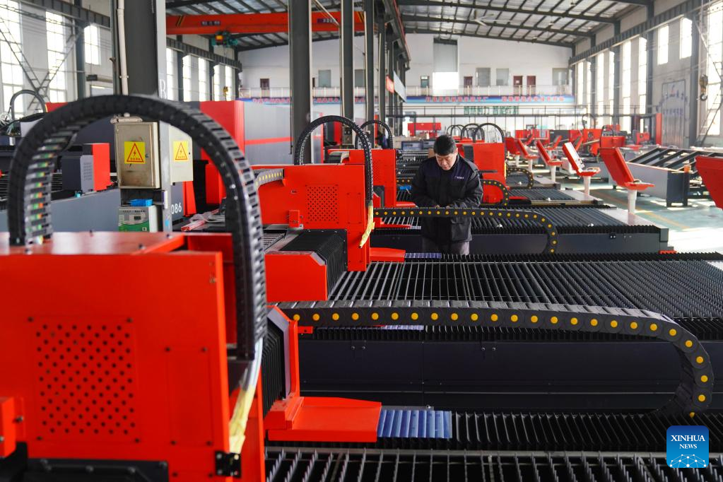A worker checks laser cutting machine products at Chuangli Technology in Xingtai, north China's Hebei Province, on Feb. 6, 2023. Hebei Province has focused on improving the innovation ability of small and medium enterprises and adopted a series of measures to support them. (Xinhua/Mu Yu)