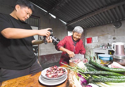 Zhang Wanlu, a vlogger, shoots footage of his grandmother in a kitchen in Zaoyuan village, Ankang city, northwest China’s Shaanxi Province. Zhang returned to his hometown to start a business, using cameras to capture his grandparents’ daily life. (Photo/Zou Jingyi)