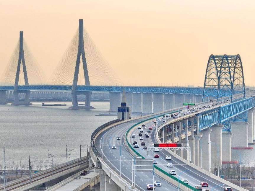 Photo shows vehicles running on a bridge in Nantong, east China's Jiangsu province, Jan. 25, 2023. (People's Daily Online/Xu Congjun)