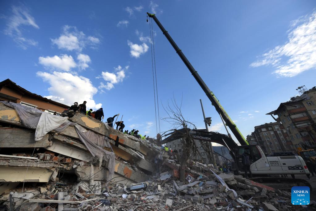 Rescue workers search for survivors among the rubble of a destroyed building in Antakya, Hatay province, Trkiye, on Feb. 10, 2023. The death toll from Monday's devastating earthquakes climbed to 20,213 in Trkiye, while another 80,052 injuries were reported in the country, Turkish Health Minister Fahrettin Koca announced late Friday. (Xinhua/Shadati)