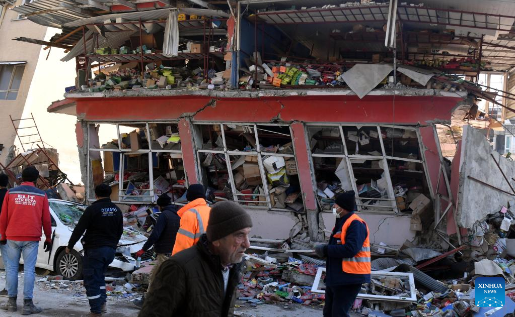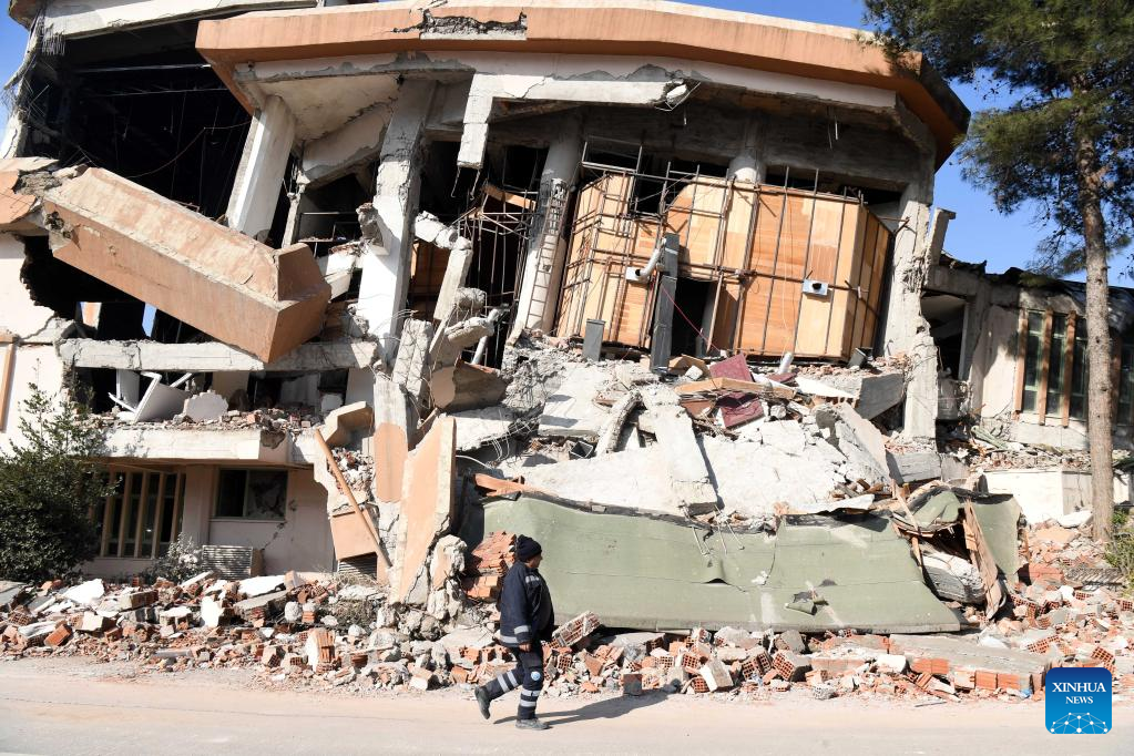 People walk past a damaged building in Antakya, Hatay province, Trkiye, on Feb. 10, 2023. The death toll from Monday's devastating earthquakes climbed to 20,213 in Trkiye, while another 80,052 injuries were reported in the country, Turkish Health Minister Fahrettin Koca announced late Friday. (Xinhua/Shadati)