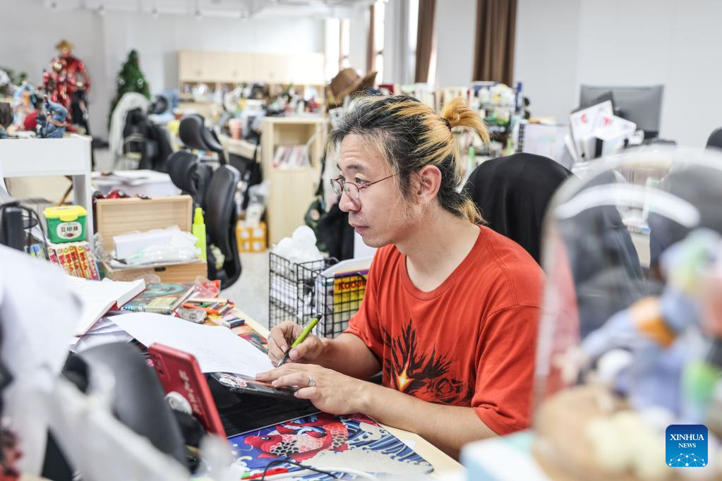 Cartoonist Liu Ke works at an animation incubation base in Changxue Village of Longqiao Town, Haikou City, south China's Hainan Province, Feb. 9, 2023. (Xinhua/Zhang Liyun)