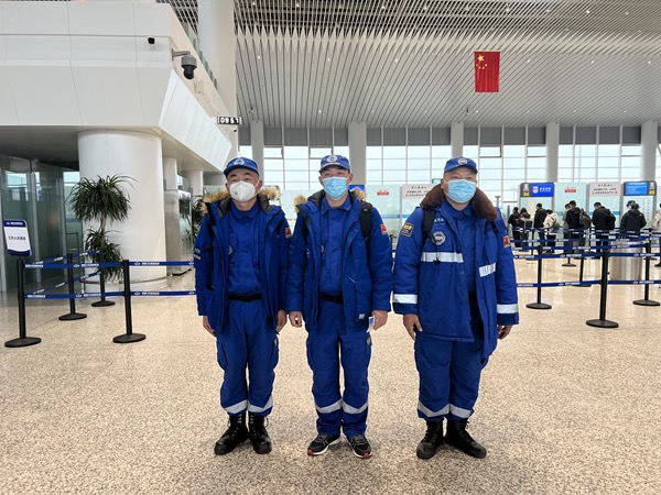 The Blue Sky Rescue (BSR) team from Nantong, southeast China's Jiangsu Province, sends another three rescue workers to Türkiye on February 11. (Photo provided by Nantong Blue Sky Rescue team)