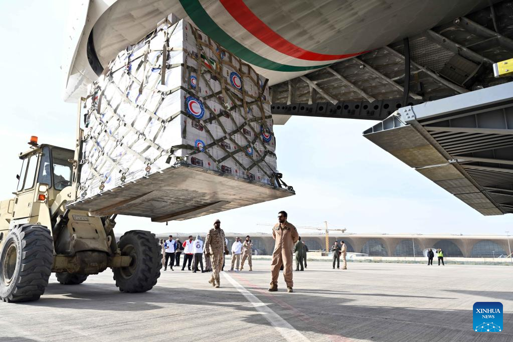 Staff members load supplies provided by Kuwait as humanitarian aid into a plane at Kuwait International Airport in Farwaniya Governorate, Kuwait, Feb. 9, 2023. (Photo by Asad/Xinhua)