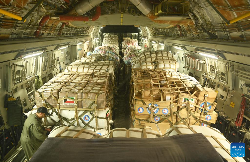 This photo shows supplies provided by Kuwait as humanitarian aid aboard a plane at Kuwait International Airport in Farwaniya Governorate, Kuwait, Feb. 9, 2023. (Photo by Asad/Xinhua)
