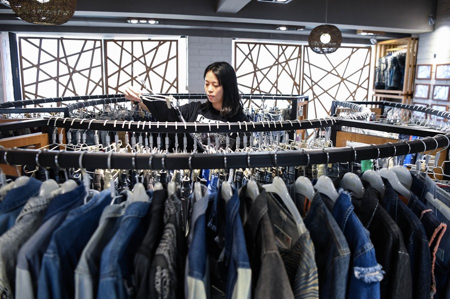 A staff member sorts clothes to be displayed online for the 132nd session of the China Import and Export Fair, also known as the Canton Fair, at Guangdong Textiles Import &Export Co., Ltd. in Guangzhou, south China's Guangdong Province, Oct. 14, 2022. (Xinhua/Deng Hua)